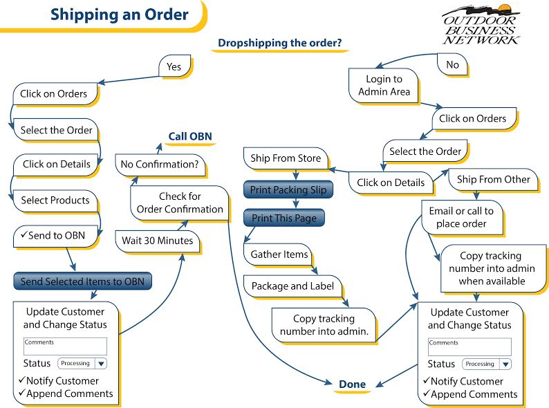 There are three ways you can ship your order: Drop Ship, Ship from Your Store, or Ship from Somewhere Else. The following tutorials will lead you through step by step the process of how to ship your order to your customer. The graphic below is a brief overview of the entire process but you can read more in the tutorials that follow.