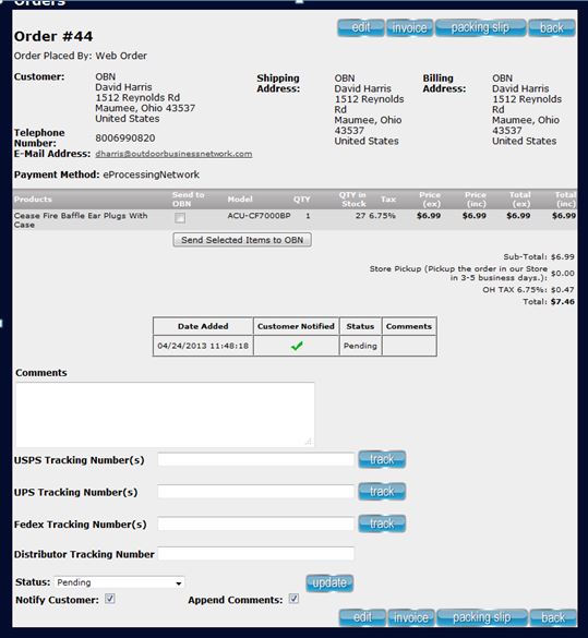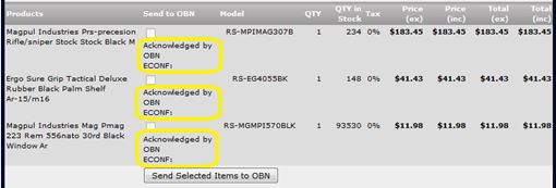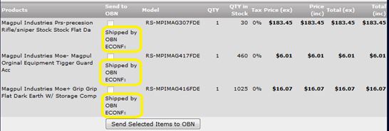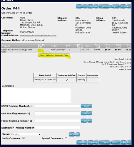 5) Below the customer contact information you will see the items your customer purchased, this is where you begin Shipping the Order. 6) Check the "Send to OBN" boxes of the items you want the distributor to send and click the "Send Selected Items to OBN" button.