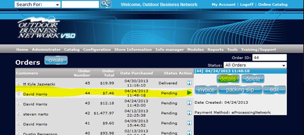 A. Drop Ship Part I 1) After you get an email notification that you have received an Order, log in to the admin area to begin. 2) Now that you are in the admin area, let's go to orders. You can go to... Store Information>Orders in the grey bar (hover mouse over the area so learners can see) OR you can get in the easy way the quick link "orders" icon in the main admin area. 3) Orders are arranged by order number so the newer ones appear at the top. Locate the order you want to begin processing and click on it to activate then click details.
