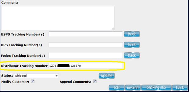 Note: This tracking number is automatically sent to your customer when the distributor makes it available. To change the status of your order you must do so manually.